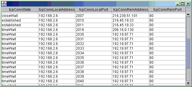 public class snmpgettable extends snmp { public static void main(String[] args) { snmpgettable s = new snmpgettable(); s.parseOptions(args, "snmpgettable"); s.getTable(); } private void getTable() { try { SnmpSession session = new SnmpSession(_host, _port, _community, _community, _version, _transportLayer); if(_isSnmpV3) { session.setV3Params(_user, _authProtocol, _authPassword, _privProtocol, _privPassword, _context, null); } //Loading necessary mibs already handled in super class (snmp.java) SnmpTableModel table = session.snmpGetTable(_oids[0]);// _oids[0] is the table name like "tcpConnTable" if(table == null) { System.err.println( "Table not found in loaded MIBs"); return; } SnmpOID authFailureOID = table.getAuthFailureOID(); if(authFailureOID != null) { System.out.println( "Authentication failed. Reason:"); snmp.printAuthFailReason(authFailureOID); return; } //print to standard out for (int i = 0; i < table.getRowCount() ; i++) { print(table.getRow(i)); } // print(session.snmpGetTableColumn("ifSpeed")); //get ifSpeed column table.setTranslateValue(true);// to use values defined in MIB table.startPolling(30);//poll table every 30 seconds //show the result in Swing's JTable showTable(table); // Thread.sleep(45 * 1000); // table.refreshNow(); // Thread.sleep(45 * 1000); // System.out.println( "To stop polling"); // table.stopPolling(); // session.close();// !!! Do NOT close session, since it's used by polling thread } catch(Exception e) { System.out.println(e); e.printStackTrace(); } } /** Displays table in a JFrame */ public static void showTable(TableModel model) { JFrame f = new JFrame(); JTable jt = new JTable(model); jt.setAutoCreateColumnsFromModel(true); JScrollPane pane = new JScrollPane(jt); f.getContentPane().add(pane); f.setSize(790, 590); f.setVisible(true); f.addWindowListener(new java.awt.event.WindowAdapter() { public void windowClosing(java.awt.event.WindowEvent e) { System.exit(0); } }); } // ---------------------------------------------------------------------- // Parsing command line options // ---------------------------------------------------------------------- protected void printExample(String programName) { System.out.println( "java " + programName + " localhost tcpConnTable"); System.out.println( "java " + programName + " localhost iftable"); System.out.println( "java " + programName + " localhost ifTable"); System.out.println( "java " + programName + " -o localhost ipRouteTable"); } }// end of class snmpgettable